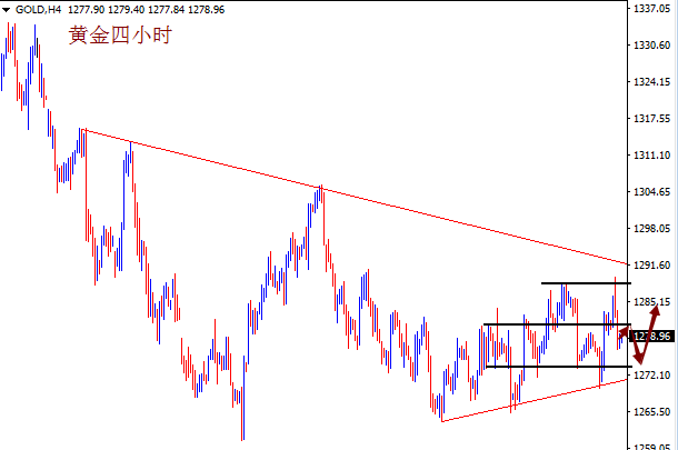 昨日现货黄金市场早盘小幅高开在1280.3的位置后行情先回踩给出1278.7的位置后行情开始拉升过程,欧盘时段行情破位本轮回落斐波那契的第一压力关口23.6的位置同时也是前日高点1283.5的位置后行情在美盘开盘时段最高触及到了1289.4附近后行情受到美国数据持续利好的影响美指拉升,黄金受压快速回落,最低给到了1276.4的位置后