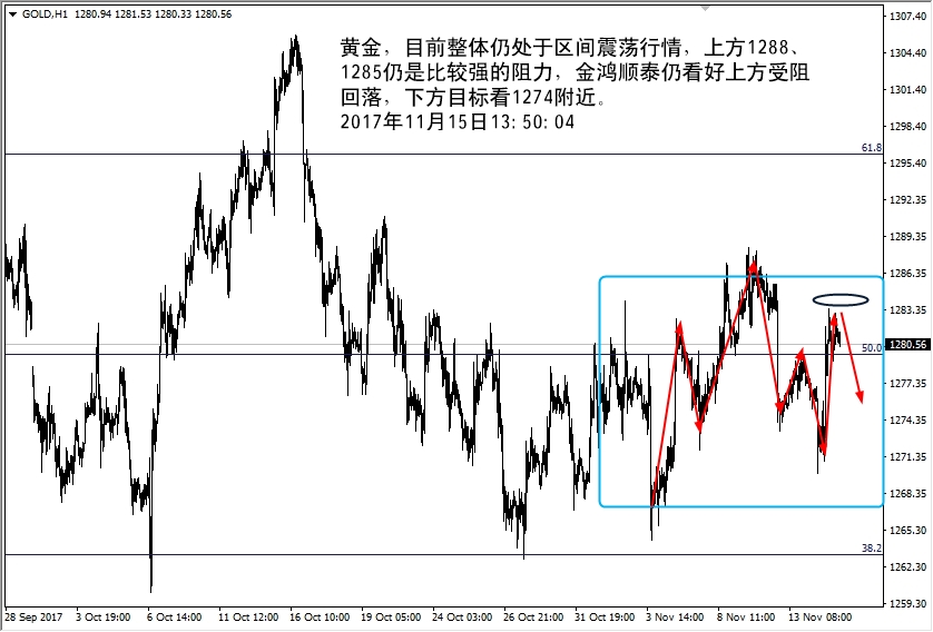 11-15下午黄金原油走势分析及欧盘操作策略 市场消息 黄金周二(11月14日)在震荡加剧后小幅回升,美市盘中最高上探至1283.64美元/盎司。周二美元下跌,股市疲弱,支撑黄金从早盘触及的一周低位回升,美国税改议案的不确定刺激了一些黄金避险买盘。 日内公布的美国10月PPI环比上升0.4%,高于预期0.1%。美国10月PPI与核