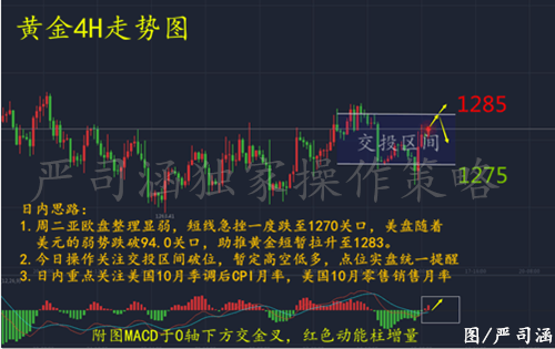 黄金技术分析 黄金日线级别上看,布林带持续缩口,黄金继续维持1265-1288区间内震荡整理,目前价格交投于日线中轨1282一线,上方继续关注1288一线压力,下方关注1275一线支撑;四小时线上看,上升通道保持的比较完整,价格再次触及通道指标下轨后反弹,布林带下轨放平,中上轨向下运行,空头能量减弱,表明虽然目前短周期整