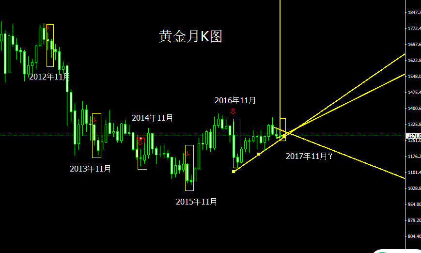 天添创盈:黄金价格年底走势大梳理,波段理论全面剖析 我们在梳理价格走势之前先回顾历史,自2011年见顶黄金价格1920美元之后,从2012年11月开始至2016年11月份中每年11月份黄金价格月线级别都是大级别下跌(2014年11月月线收十字K),从大跌之后历史不断重演角度来看,今年11月份月线级别收大阴概率相对较大,其次每年12月