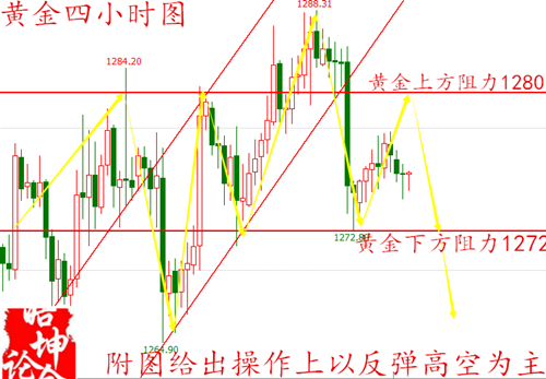 黄金走势分析,日内支撑阻力在哪儿及操作建议! 从走势上看,黄金日线级别上上周五直接一根大阴线砸下来,给人感觉空头卷土重来之势,但是从今日黄金来看,并没有跟随上周五的大阴线继续惯性下跌,而是开盘后小幅下挫开始走高,目前日线在底部收出小阳线,皓坤认为黄金短线还有反弹的空间,个人预测日内黄金会上行测试1278-