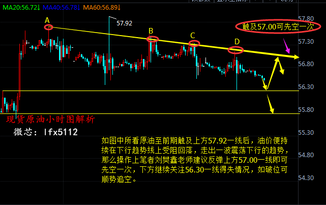刘樊鑫:11.14现货原油、中远黑角、外汇原油欧盘操作建议 周一(11月13日)油价在小幅上扬后惊现深V走势并最终收跌;具体来看,WTI原油期货价格收盘下跌0.17美元,报56.73美元/桶,跌幅0.30%;布伦特油期货价格下跌0.47美元,报63.13美元/桶,跌幅0.74%。而周一公布的欧佩克月报将明年全球原油需求增速从138万桶/日上调至15