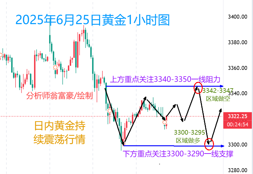 周三(6月25日),现货黄金收报3332.02美元/盎司,微涨0.27%,但前一日曾触及两周多低点。周四亚市,金价交投于3336.80美元/盎司附近,显示市场在关键经济数据公布前保持谨慎。江沐洋认为,黄金缺乏突破新高的动能,短期内可能偏向下行。 黄金后半夜总是开启一波反弹,不过黄金还是没有反转,黄金早盘冲高还是承压3340一线压制,黄金这两天的行情开始震荡了,不过黄金多头还是没有形成反转,早盘反弹高位还是继续空,早盘现价3335直接空。黄金1小时均线还是死叉向下的空头排列,黄金空头还是有动能的,黄金短期的关键位还是在3340一线,黄金早盘虽然看似强势的反弹,不过依然承压3340一线开始回落,
