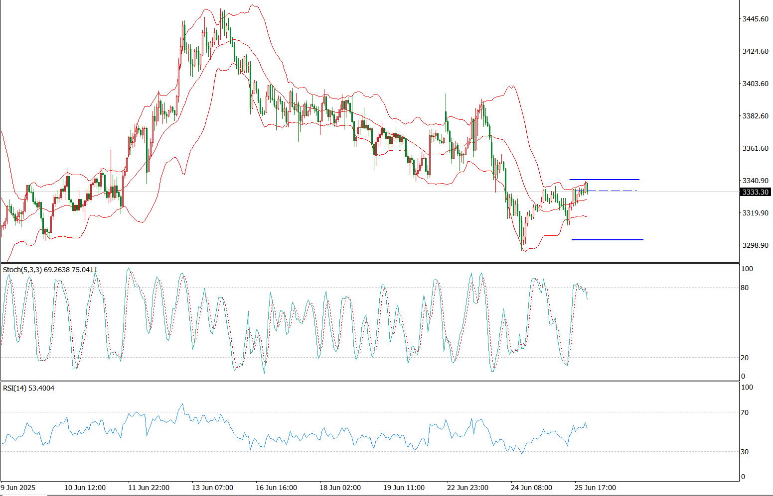 6月25日亚市盘初,现货黄金维持窄幅整理,周二金价下跌2%,创两周多来新低,主要因伊朗与以色列达成停火协议削弱避险需求,叠加美联储主席鲍威尔对降息持谨慎态度令多头承压。盘中金价一度重挫逾2%,最低触及3295.38(6月9日以来最低),最终收报3322.93。技术面显示,60日均线支撑位在3290附近。昨日黄金持续下行,最低下探3295,日线布林带三轨呈现缩口状态,表明价格波动区间压缩至3290-3420。当前价格处于日线中轨与下轨区间(3290-3355),短期均线向中轨靠拢显示震荡格局延续。MACD指标死叉且放量,预示黄金将维持低位震荡。 从4小时级别分析,黄金在向下破位前可能出现多头反