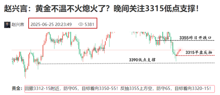 回顾昨天的思路和策略安排上,虽说一天都没什么太大的波动,但晚间提前给出了3312-15的多单布局,晚盘最低跌至3311一线,凌晨上涨至3340的高点,一天就布局了这一单,也算是有所收获,有关注兴言的朋友应该已经跟上了,那么对于今天来说,短线上又该如何布局呢?下面兴言就给大家来讲讲! 市场观点分歧加大,金价短期方向盘整 尽管黄金昨日收涨,但目前来看,若缺乏新的避险催化或美联储继续按兵不动,黄金恐再度回落,因为黄金迟迟未能在诸多利好下创下新高,反而反复受压,说明上行动力不足。“若中东局势持续平稳,金价短线还有下探的可能! 与此同时,标普500与纳指本周接近历史高点,市场风险偏好并未显著转向防御板