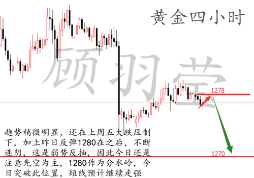 上周录得一根中阳线终于结束了连续三周的阴跌状态,本以为周五能够站稳1280上方结束震荡格局,但是机构始终不让我们如愿,黄金价格再次被强制拉低至震荡区间内来,四小时线上看,布林带三轨放平,隔夜一波跳水试探下轨支撑后反弹并收取一根十字星,日内稳步反弹,K线再次突破MA5均线,附图指标上看,MACD空头能量柱缩量,st