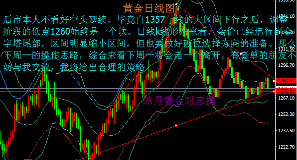 本周总结:黄金本周整体呈现震荡的调整走高态势,周线收小阴线,周一下探下方强支撑1265一线企稳反弹,日线收探底大阳线,周二受阻1280一线压力位,日线收中阴线震荡探底前期盘整小平台实体部分;周三企稳拉升日线以中阳线报收,周四继续保持冲高动能,日线收小阳线,周五尾盘空头袭击,多头二次上破波段1306到1265的61.8%位