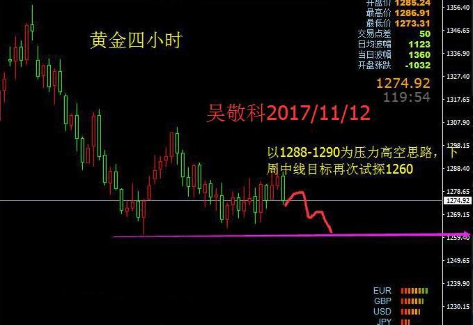 本周总结:黄金受避险因素、特朗普亚洲之行存看点,美国税改方案受阻,美元指数走跌,黄金周初从1273附近震荡上行,一度突破1284阻力,最高到达1288一线受阻再次震荡。美国参议院和众议院版的税改方案出炉使美元突遭抛售、道指一度重挫超过200点、恐慌指标VIX狂飙20%!加之沙特避险情绪支撑黄金,美元本周势将录得四周以来首