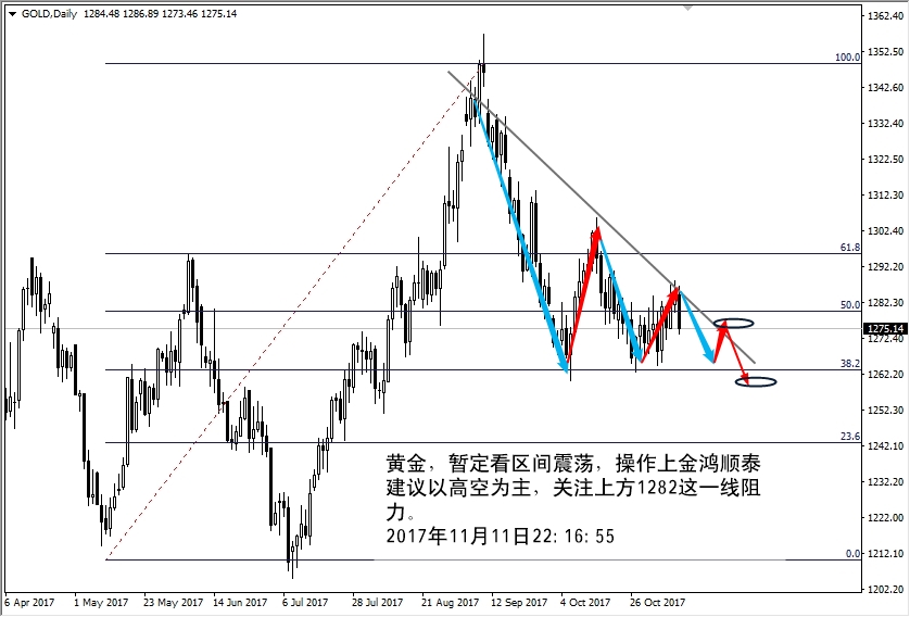 张尧浠:黄金良好上行遭砸盘牵制,关注1282阻力多头再起 金融市场交易日11月6日-10日当周,现货黄金在受到中东局势的沙特反腐行动及美国税改变化性刺激等情况下破重要的压力关口1280美元/盎司位置,本应该在周五继续收取阳线的,却还是继续遭到接二连三的巨量砸盘打压,在美盘尾时段,出现几个合计名义价值超40亿美元的抛单