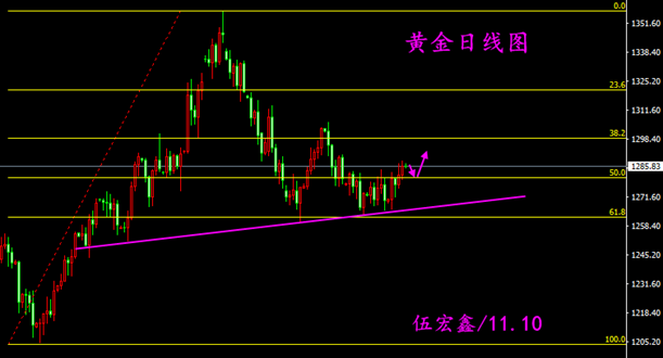 北京时间(11.10程金臣/撰)黄金怎么形容呢?,这一句山重水复疑无路,柳暗花明又一村很贴切。前期近半个月的震荡看不到出路,近两天在避险情绪,以及美元走低的因素刺激下,黄金多头才扳回了一些优势,并开始蠢蠢欲动。昨晚公布的美国数据喜忧参半,由于初请表现好于预期,令黄金小幅承压,但随后市场再现机构砸盘,金价一