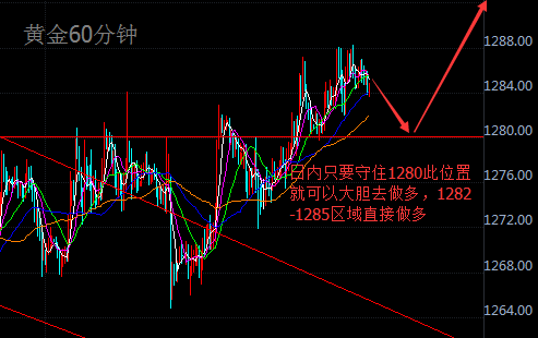最近黄金的行情很简单,就是一个震荡偏多的行情,先是不断的在低位震荡来回颠簸,一会给你一种要突破的感觉,然后很快就跌下去了,看起来要跌了,然而企稳拉升就上演了,近期就是这么一个情况,上涨突破不了1288的压制,下探突破不了1278支撑,行情反反复复,但叶虎晨本人还是比较喜欢这样的行情,因为点位好把握,而且获利