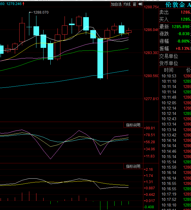 国际现货黄金周四(11月9日)亚市早盘开于1281.45美元/盎司后,金价震荡下行,录得日内低点1280.04美元/盎司后金价转盘整。欧市金价震荡上行,多头不断拉高,但涨势未能持久,金价转跌。美市下探后再度攀升,录得日内高点1288.39美元/盎司后转跌,金价震荡下行,终收于1285.05美元/盎司。终收于1285.05美元/盎司,上涨3.6美