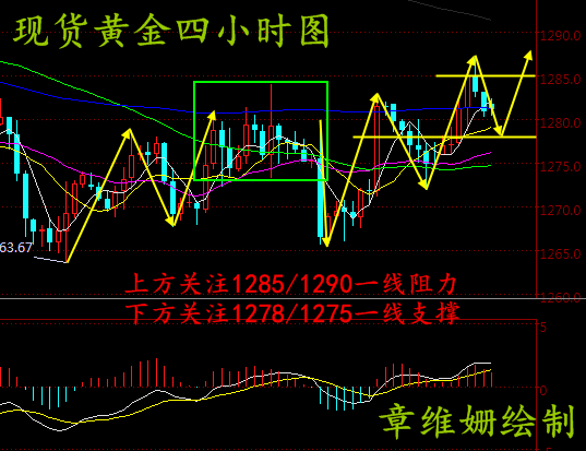 黄金周三整理上升突破区间。将新的空间拉开至1276-1286.空间上依旧是10美元的震荡,亚欧盘回踩整理。长时间整理过渡,美盘时段发力突破。刷新近期新高点1286.60.不过延续性依旧不强。探高后承压回落收盘在1281附近。日图收盘带有上影线的中阳线。消息方面:除了美元走软之外,地缘政治担忧也令黄金受到提振。日内稍早,特朗