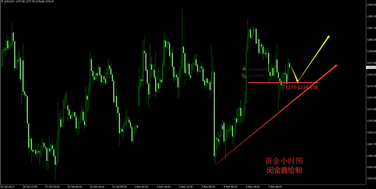 从10月23日开始黄金一直处于15美金左右的宽幅震荡当中,无论黄金如何挣扎,总是逃不过这个区间范围的枷锁,上周非农黄金并没有延续空头趋势,周一盘中震荡回升,昨日晚间美盘时黄金短线再次飙升重新站上1280关口,多头重拾信心一举上攻时,遭遇两次砸盘再次将金价拉低至1271附近,昨日晚间策略是回撤至1272附近多单入场目标
