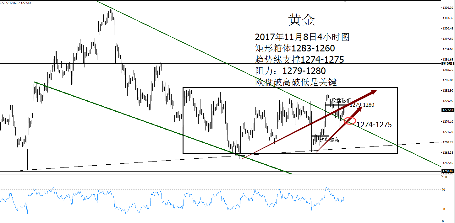 Anna点解:黄金区间震荡,美日114.2空,EIA原油 11.08 黄金连续两周陷入1283-1260范围内震荡,横有多长,竖有多长下降趋势中横盘调整时间越长,越容易出现反转,而这个反转需要一个确确信号便是先上突破1283,破位回踩接下来的思路就需要调整为逢低做多。这就是本周谨慎操作的原因,行情随时准备出方向,在没有给出详细方向