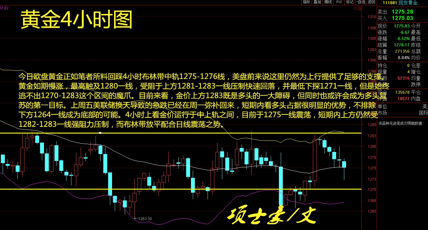 项士豪:11.7晚间美盘已获利8.42美金,后市走势分析及策略 黄金走势分析: 今日欧盘黄金正如笔者所料回踩4小时布林带中轨1275-1276线,美盘前来说这里仍然为上行提供了足够的支撑。黄金如期慢涨,最高触及1280一线,受阻于上方1281-1283一线压制快速回落,并最低下探1271一线,但是始终逃不出1270-1283这个区间的魔爪。目前