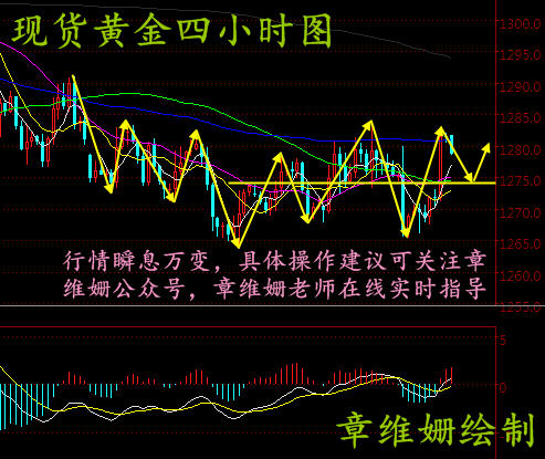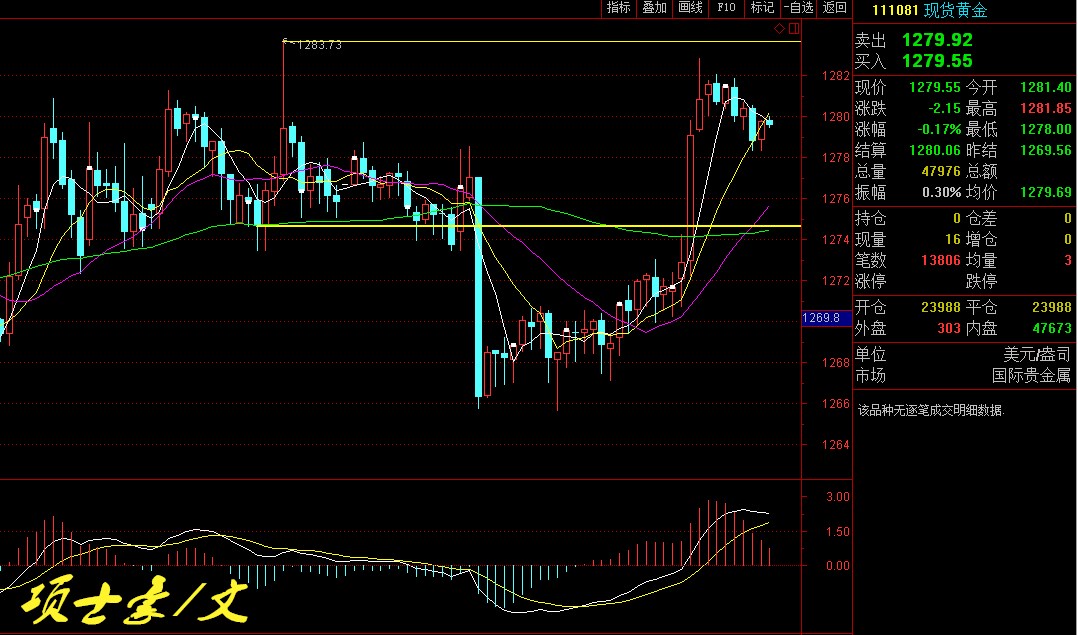 项士豪:11.7隔夜黄金冲高后市策略 黄金行情分析: 昨日黄金亚欧盘时段基本符合预期技术走势,震荡上行承压1272/73压力。后半夜市场因对沙特乱局产生地缘局势风险的担忧,避险情绪陡增,黄金也受到避险买盘拉动,致其突破1275压力,并一度站上1280,,最终日线收得一大阳线,贯穿突破5、10日均线,且再度测压至20日线。 从技