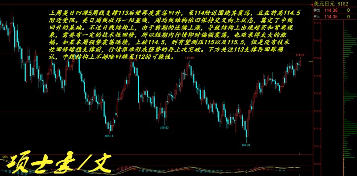 项士豪:11.6美日走势分析及策略 美日行情分析: 上周美日回踩5周线支撑113后便再度震荡回升,至114附近围绕其震荡,且在前高114.5附近受阻。美日周线收得一阳星线,周均线结构依旧保持交叉向上状态,奠定了中线回升的基础。不过日线结构上,由于前期的连续上涨,导致结构上出现超买和背离现象,需要有一定的技术性回修,所