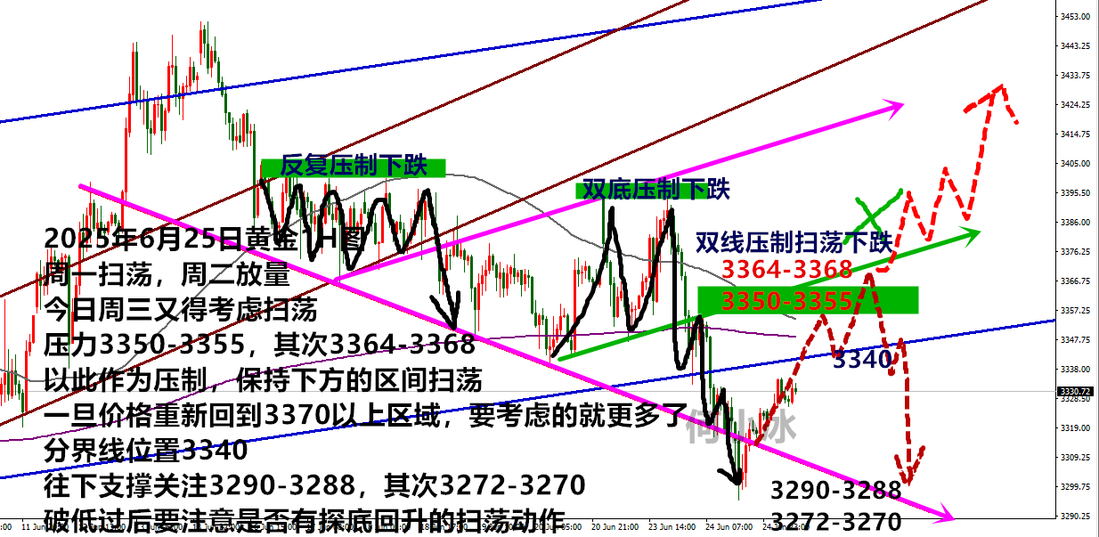 昨日伊朗与以色列冲突出现戏剧性转折:特朗普宣布停火协议后,双方军事行动仍在持续,伊朗甚至对卡塔尔美军基地实施报复性袭击。尽管正式停火尚未签署,但短期缓和预期推动市场避险情绪降温,黄金价格跌破3300美元关口。不过,联合国秘书长警示局势存在"全面失控"风险,叠加伊朗报复行动,地缘政治风险仍未消除,黄金仍可能因突发冲突反弹。值得注意的是,伊朗对美实施报复后,美国未升级冲突并宣布停战,这一意外发展缓解市场紧张情绪。特朗普言论亦未表现出进一步激化矛盾倾向,与市场预期形成反差。随着地缘风险缓和,避险情绪回落对黄金形成下行压力。 从技术面分析,日线级别收大阴线确认显著回撤,小时图形成乌云盖顶反转形态,当