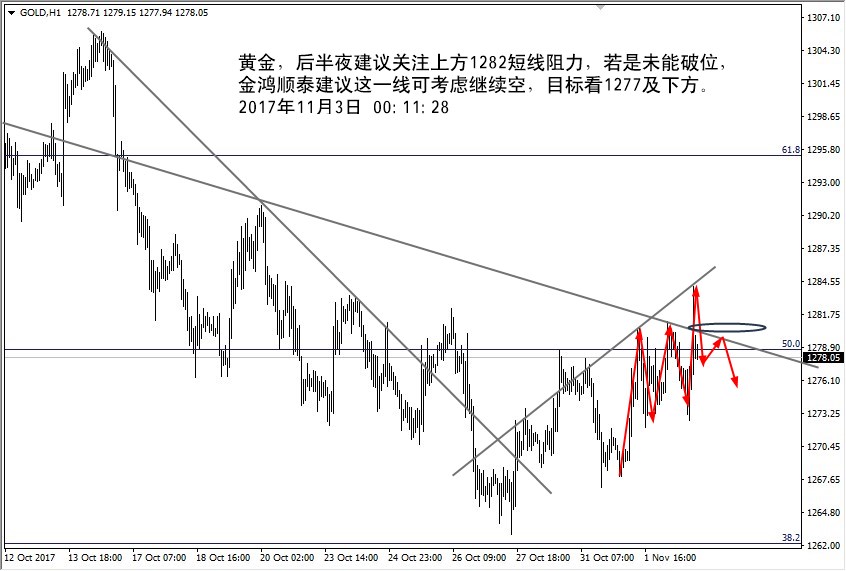 北京时间21:55美联社公布:美国总统特朗普据称将宣布美联储理事鲍威尔为下届美联储主席人选,导致黄金短线拉升7美金,然而今日初请数据利空,非农前值过高,空头高企上方打压直接下行至1276一线,永才点金早间给出的建议在1273附近进场多单成功获利7美金后在高点1283进场空单1276一线支撑,晚间成功获利14美金,详情可关注