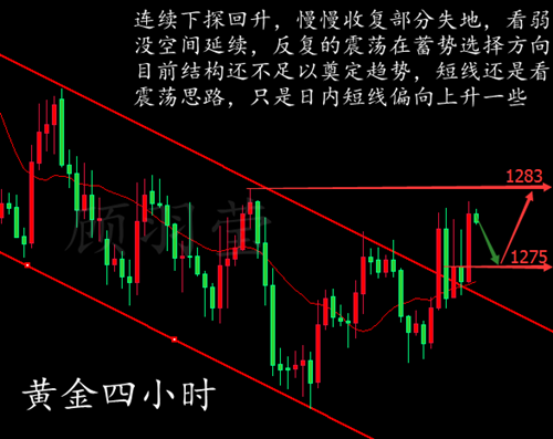 市场给了你翻仓的机会,你没有抓住,那你就要从自己身上找原因了。做交易不能死脑筋,随时转换思路很重要,方向错了,就要及时改正。自己没有信心,就让我来给你信心。黄金,昨日日线上收取一根上影线较长的阳线,MA5/MA10均线有勾头向上之势,运行于1274一线,布林中轨及MA30均线于1282附近形成关键压制,站稳其上方,黄金