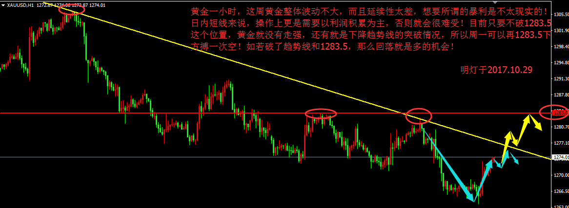 一周时间匆匆而过,本周黄金走势可谓是大起大落,连续三天的1270-1280一线的区间震荡,多空反复无常。最终因周四美元大涨及众议院通过税改预算方案等一系列利空因素影响,黄金收跌0.84%,创两个多月最低收盘价。这段时间的黄金走势叶虎晨相信有实时关注行情的投资者,必然是见证了行情的精彩之处,行情的来回变化让不少的投