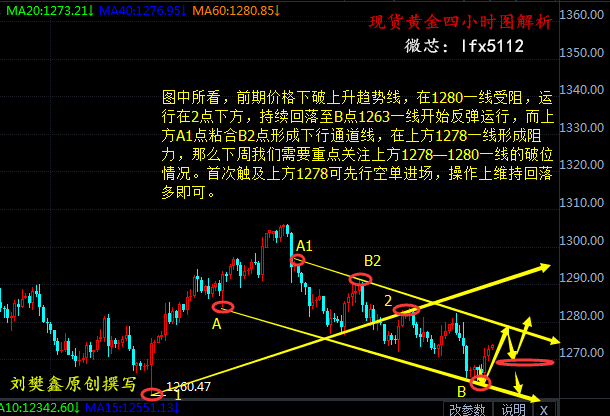 ===下周黄金行情走势预测及操作思路 本周黄金围绕美联储主席人选和欧央决议在1280-1265区间多空来回震荡。目前来看,接近月初非农的低点,目前虽然没有突破前期低位1260一线,但是近在咫尺也让多单被套的朋友忧心忡忡。上升高点的不断下移,1288-1282-1277-1273的压制稳定并且坚定,显著的压制在一次次的反弹中越发的坚不