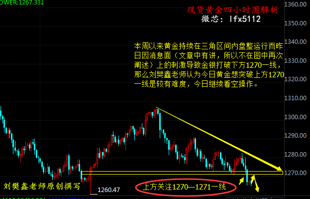 刘樊鑫:10.27现货黄金暴跌继续盘整,鼎展黄金1270继续空 昨日的现货黄金走势,对于黄金多头来讲可谓是黑色星期四早间急涨之后在1282美元一线受阻,从欧盘开始刘樊鑫感觉空头已经在进行布局,并等待晚间的数据加速,这样的行情当然不能错过,刘樊鑫团队也是在1282一线进行了顺势的潜伏布局,在昨日的文章中就已经有提示,数