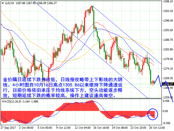成子西:10.27亚盘空单止盈三个点,欧盘黄金如何操作 昨日周四(10月26日)黄金高位回吐跌破1270关口一线,周初连续三个交易日10美元左右的空间来回压缩震荡运行,如单单靠技术面上那么黄金是难以突破下行的,而昨日黄金借助消息面完成突围,打破下方1270关口一线。昨日亚欧盘时段黄金先诱多反弹至1282附近一线,但始中未能