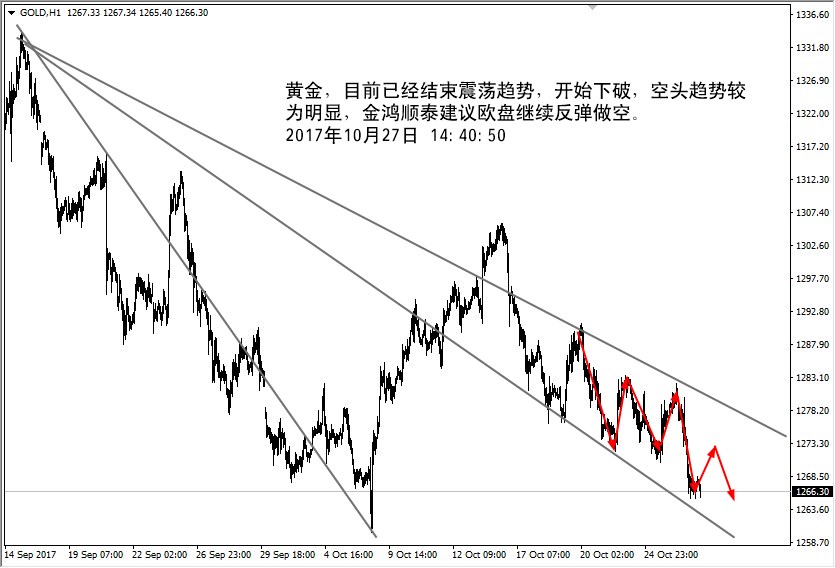 10.27黄金下破有效支撑收线1267!别错失芝麻再丢西瓜! 破位即是单边,犹豫便失江山!平淡无味了数日的黄金走势终于在昨天有了看点,金价终于跌破了近期的震荡区间,也跌破了关键支撑水平1272美元/盎司至1270下方。,光头大脚大阴K线刺穿前期所有涨幅,近10美金的下跌,让做空赚大赚,死多者阵亡! 没有错误的行情,只有正