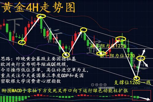 黄金行情技术分析 昨天1272附近支持最终还是跌破,跌势延续!而关键性的支撑区域跌破之后,则预示新一轮跌势的延续或开启!而下方短期支撑则是在1256,进一步则是在1250附近!而上方1270-1272目前已成为新一轮跌势开启的反向阻力点!日内操作上,在此阻力附近做空即可!今日是本周最后一个交易日,要以稳健操作为主,切记激