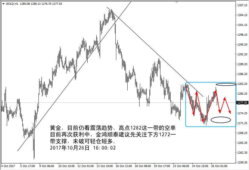 周四(10月26日)美元指数小幅走弱,因市场部分投资者为晚间欧洲央行利率决议做一些对冲交易;金价则温和反弹,但整体仍处于震荡走势;多数非美货币也受到支撑;原油市场,油价受到美国产量增加的压制,但此前OPEC方面的动态仍提供支撑,多头仍有机会。 回到盘面: 黄金价格昨天最低跌到了1270美元,基本符合预期,从周一开始