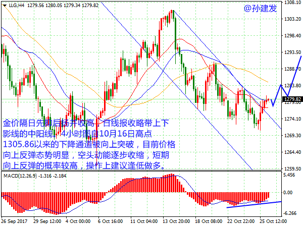 邹鑫悦:10.26会议纪要来袭黄金反弹结束仍需空 标签:国际黄金,邹鑫悦,行情分析,操作建议 投资很简单,跟对人,找到方法,便赢了一半。我相信我邹鑫悦能给你这一半,你是否愿意给自己这个机会? 从短线图4小时上看,金价在触及1271附近后节节攀升,现突破布林中轨阻力,MACD指标金叉上扬,红色动能放量,上轨阻力在1283附