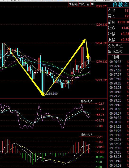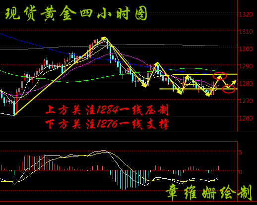 黄金昨日行情回顾 昨日黄金亚盘一直维持横盘状态一直在1280-1282区间震荡,欧盘开始震荡下行,欧盘尾声跌破1278支撑最低触及1275一线,美盘开始小幅度反弹。昨日线图上看技术指标上来看附图MACD指标上的快慢线虽然黏合即将形成死叉,但是双线有向上运行的趋势,包括KDJ指标,三线已进入超卖区,STO也一直在超卖区附近运行。