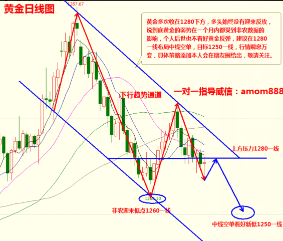 任何东西只要足够迷惑你,就足以毁了你,并非心软是病,情深致命,市场多少人为了证明自己,最终迷失自我。人生里面不断的填充,也要学会掏空,努力是为了有更高层次的认知,而推倒归零是为了不膨胀永往直前。抬头是为远方,低头是寻找自我。 本周延续了黄金的弱势,在1283-1270趋势徘徊震荡,很多人不明白非农数据,新手投