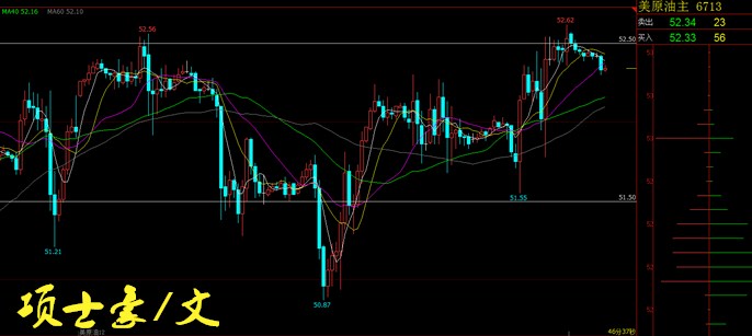 项士豪:10.25原油午后走势分析及布局 原油走势分析: 昨日整体走势呈现高位宽幅震荡,盘中行情短线多次出现急涨急跌,而价格在持续多日之后也终于向上突破了前期密集压力区52.3-52.4,凌晨4点半公布的最新API虽然显示库存增加,不过由于受到市场预期欧佩克将会再度延长减产协议利好影响,油价继续强势震荡反弹,最高触及52.