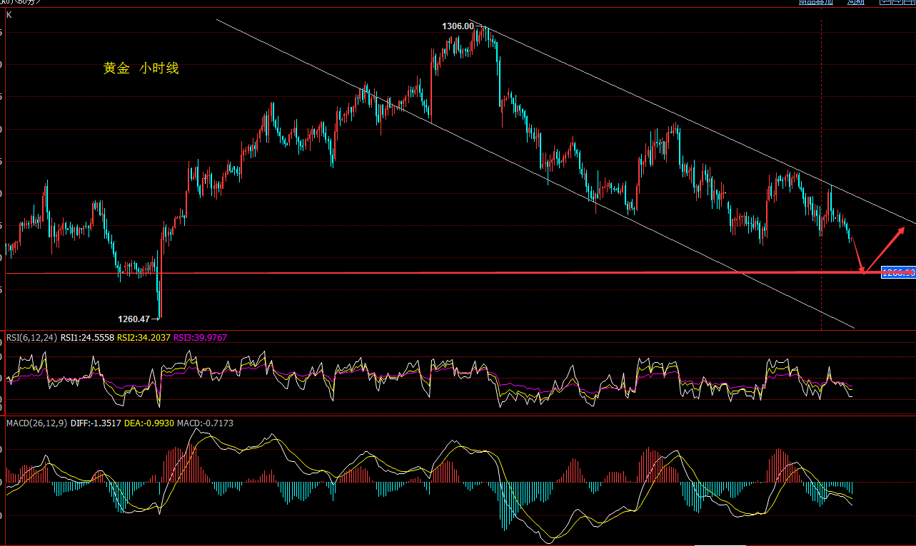 这个行情做到后面会越做越迷茫,因为波动一直都不会太大,还好方向目前来说是明确的,上周在1305遇阻回落,虽然到上周四出现反弹,但最终周五杀跌让价格仍然跌回去,随着周线收阴已经一定程度上破坏了前面非农开始的反弹,按照这种形态本周黄金是要二次下探1260低点的,周初行情又走了一次反复,其实是将下跌的时间拉长,以