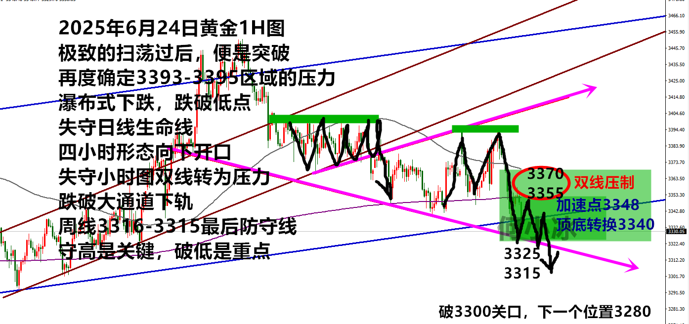 何小冰:破位总是在不经意间,守高和延续是关键 上周五价格到达3340关口,期盼的直接跌破大通道下轨进行放量加速下跌,然而并未有,反而通过两次差不多50美元左右的扫荡,反复测试3393-3395的动作,最终才确定阻力,今日周二加速下跌,跌破大通道下轨位置 昨日周一早盘跳空高点3395-3396 , 午夜过后探底回升再度测试3393-3394阻力 ,从而形成双顶压制,开始了稳步下跌,跌回3380,今日周二早盘跌回3370进一步放量下跌到3333 同样是二次确定阻力后进一步放量下跌,这一次的阻力位置是3355-3357 ,午间第二次确定此处的阻力后跌破3333,进一步下跌到3316 一气呵成完成破