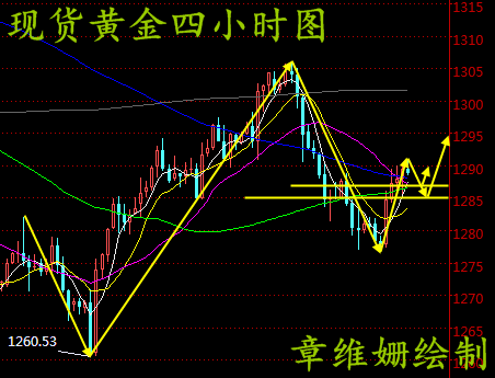 昨日现货黄金市场区间波动,行情早盘开盘在1280.7的位置后行情先回落给出低点1276.6的位置后行情受到避险情绪刺激行情开始拉升过程,盘中最高触及到了1290.3的位置后整理,最终日线收线在了1289.6的位置后,以一根下影线较长的大阳线收尾,而这样的大阳线形态收尾后,日线反转阳包阴,回踩低多。 1.技术上,今日看4小时构造