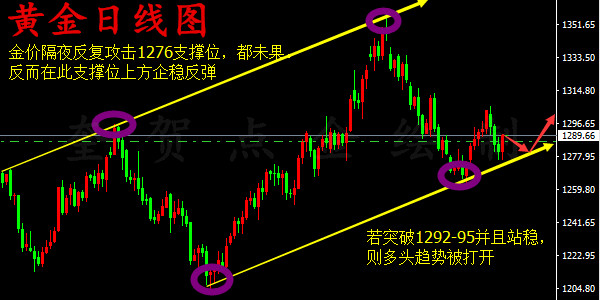 昨日黄金可谓是风云变幻,周三黄金到达了1277的结构点位后,黄金开始反弹上涨,最高到达了1283一线后,反弹无力在1280上方震荡,昨日早盘黄金小幅冲高后,再次下跌,最低到达了1276一线,空头大有卷土重来之势,然而就在看空黄金的投资者旗鼓喧天的欢喜之时,黄金开始小幅的反弹,但依旧没有让做空者的情绪消退,大喊逢高空