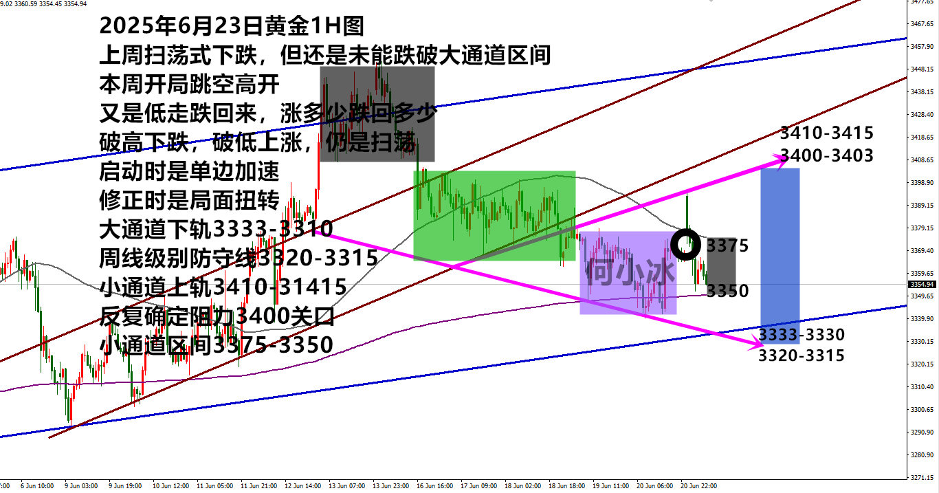 何小冰:乾坤未定,金价多空都可能是黑马 今日周一由于中东局势升温,早盘跳空高开冲刺3395,然后直接全部跌回,截止发稿价格跌到3347区域, 涨多少,跌回多少, 将扫荡进行到底,而且这种涨跌是一气呵成的结果,启动预算30-50美元空间左右 那么接下来的行情怎么看?我们通过大小周期的信号来定: 1、周线围绕10日均线作为分界大区间扫荡 ,现在 此处位置在3320-3315区域 ,这是本周的重点 2、日线连续一个月守住生命线位置 ,这是另一个重点,需要最终收线结果才能知道得失,过程中的刺穿都只是假象,往往 最后一刻又会“覆水重收”, 现在这个位置在3350区域 3、四小时仍是呈现收口的状况 ,而
