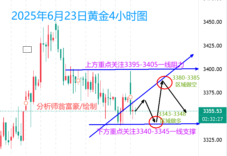 当地时间6月21日(周六),美军动用B-2战略轰炸机对伊朗核设施实施精确打击,导致中东安全局势急剧恶化,引发全球金融市场连锁反应。避险资产配置需求激增推动黄金、原油价格于6月23日(周一)跳空高开后维持宽幅震荡格局,美元指数盘中刷新近三周峰值,与此同时美国股指期货一度下挫近1%。市场参与者正密切评估伊朗潜在反制措施、美伊外交互动进展及地区冲突扩散风险。本次军事行动标志着美伊对抗进入新阶段,对全球经济秩序和地缘政治平衡产生深远影响。从黄金盘面表现观察,早盘时段呈现显著高开态势,价格峰值触及3398一线后回落,当前技术形态显示为震荡整理结构,尚未形成明确单边趋势。 从4小时K线形态观察,早盘冲高