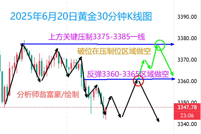 金价多空博弈加剧,美联储鹰派信号与美元走强施压金价,地缘风险溢价与通胀预期形成支撑。短期来看,以色列-伊朗冲突升级或推动避险买盘,但美联储政策路径及贸易政策实际落地效果将主导中长期趋势。重点关注未来两周美国对伊政策动向、伊核协议谈判进展及美联储通胀应对立场。需注意伊朗方面对第三方干预的警告与美国可能介入的潜在风险之间的博弈,该不确定性为金价提供阶段性支撑。 黄金日内交易策略,区间与破位需同步关注。当前空头趋势延续,早盘3385阻力有效,反弹依托3360-3365压制维持高空策略,下方支撑看3330-3320区域。重心持续下移背景下,3375-3385构成短期关键压制,未突破前翁富豪建议保持空