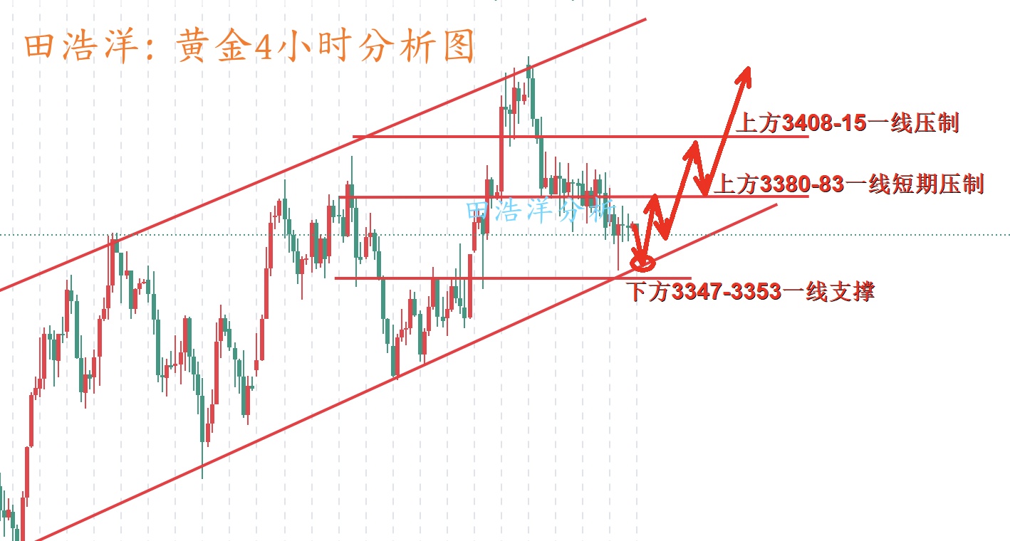 黄金本周只从周一开盘高开上涨后,最高触及3452一线后开启了本周的震荡回踩之路,截止今天周五,黄金依旧在下方区间内进行震荡调整,但是从4小时行情走势来看,黄金趋势上依旧是以多头为主,短期黄金低位震荡调整今天周五我们先关注下方3347-53一线的支撑位,这也是昨天最低触及反弹的起涨点,今天周五如果不突破此位置,那么我们以反弹看涨收官为主,如果你目前黄金操作不理想,希望田浩洋能让你的投资少走弯路,欢迎前来沟通交流! 从4小时分析来看,下方支撑关注3347-53附近,上方短期阻力关注3380-83一线关口,重点关注3408-3415一线压制,继续依托此区间保持高空低多循环参与主基调不变,中间位置一