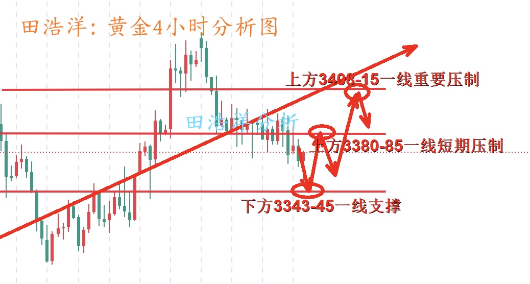 周四黄金再次探底回升,最低触及3347一线,截止目前反弹至3370一线,今天白天我们3373一线多单遗憾止损了,黄金受凌晨利率的影响之下,凌晨最低触及到3362附近后开始反抽修正,多日的来回扫荡也让我们对市场有了更大的期待,在凌晨破位之后,早间的反抽也无疑是多头的一种修复而已,自周一下跌以来,周二的小十字星就是一种信号,也是多空抉择中的一种信号,晚间我们反弹再找机会做空。如果你目前黄金操作不理想,希望田浩洋能让你的投资少走弯路,欢迎前来沟通交流! 从4小时分析来看,下方支撑关注3343-45附近,上方短期阻力关注3380-83一线关口,重点关注3408-3415一线压制,晚间继续依托此区间保