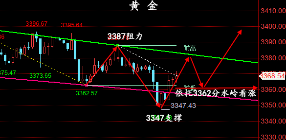高晓峰:6.19黄金日内意外下挫!短空策略及思路解析 黄金走势今日再度出乎意料,早盘持续维稳3370上方,临近午后也未跌破该关口,但开仓后行情快速下探至3350一线。当前短线空头占优,首要目标指向3347支撑位,若实体突破则可能进一步下探3330附近。从4小时图看,趋势整体偏弱,虽不排除日内继续回落风险,激进者可直接追空。操作上更建议关注欧盘表现,谨慎者或等价格反抽至3378-3383区域,可跟进空单。 晚间黄金建议:激进者3370可现价空 谨慎者反弹3378-3383附近补仓空 止损3388 目标3330 文/高晓峰(jcx68008)专业国际市场点评 ,本人解读世界经济要闻,剖析全球投