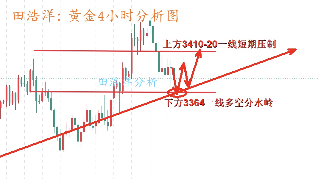 黄金昨天震荡了一整天,最终都没有打破我们所给的区间,今天我们继续关注下方3364-66一线支撑情况,因为此位置也是昨天我们给的重要关键支撑,也是多空分水岭,昨天我们所给的75-80一线多单全部获利出局,今天我们保持回踩找机会做多的思路继续进行,只要不破下方关键支撑位置,那么多头卷土重来一定会有希望,如果你目前黄金操作不理想,希望田浩洋能让你的投资少走弯路,欢迎前来沟通交流! 从4小时分析来看,黄金下方继续关注3364一线重要支撑,上方短期关注3408-15一线短期压制,操作上暂时以区间进行为主,短线大概率还有延续震荡的可能。具体操作策略我会在盘中提示,及时关注。 黄金操作策略: 1、黄金回踩