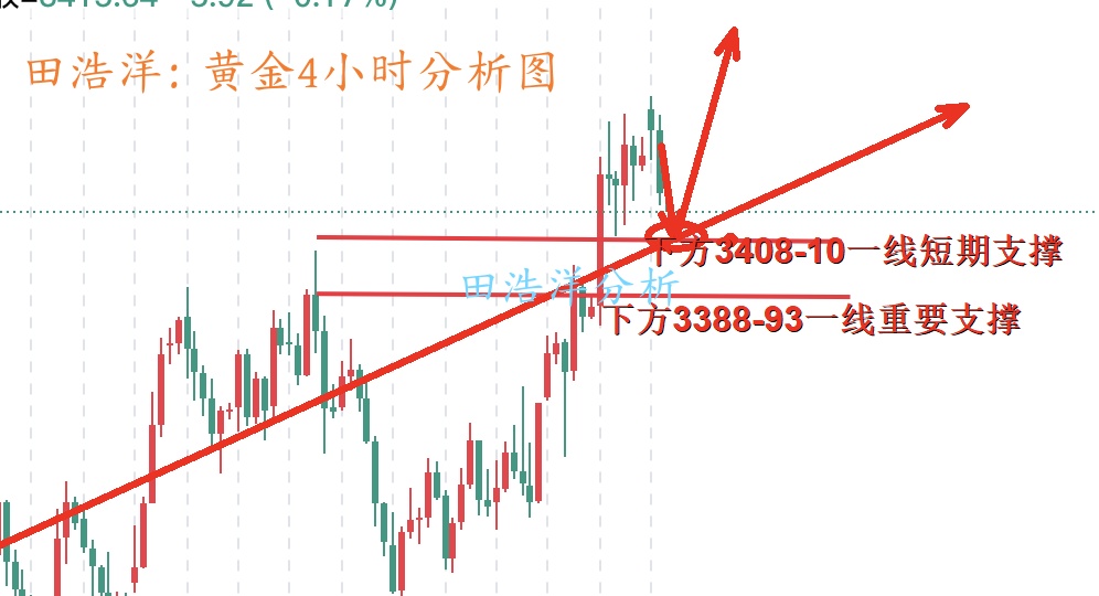 上周五黄金技术面延续多头极强单边震荡上行节奏,日线级别连续三个交易日以强势中阳收盘,整体价格延续多头极强单边震荡上行节奏,今天开盘高开在3448一线,最高触及3452一线回踩,截止目前最低回踩3409一线反弹,我们白天文章给了3425一线多,我们实盘也给了3408-10一线补仓多,现在3418-20附近已经获利出局,目前的行情走势就是回踩做多,趋势依旧没有变化,大家不要被回踩调整所误导,回踩我们找准进场点位进场。如果你目前黄金操作不理想,希望田浩洋能让你的投资少走弯路,欢迎前来沟通交流! 从4小时行情分析来看,下方支撑关注3408-10附近,短期多头强势分界线上移至3388-93一线关口,日