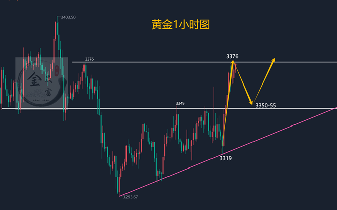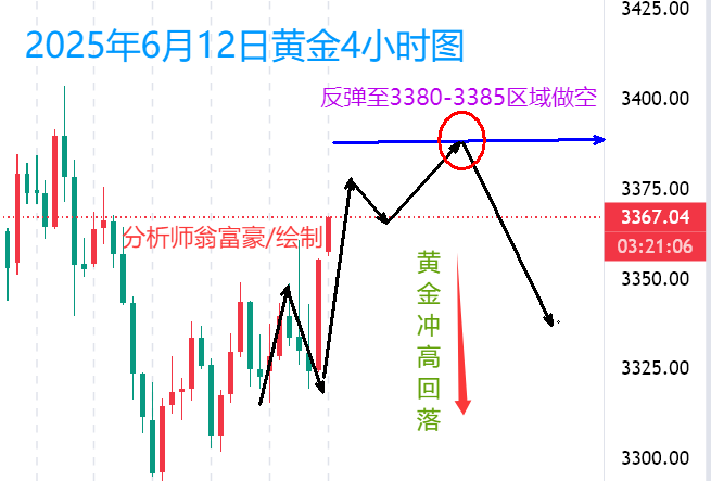 昨日晚间数据公布显示,美国核心CPI环比增长0.1%,表明通胀较上月有所缓和,这一结果超出经济学家预期——此前他们预计5月关税上调将推高价格涨幅。数据发布后,市场对美联储货币政策预期显著调整:未来一年累计降息幅度预期从67个基点升至77个基点,12月前累计降息幅度预期从42个基点上调至48个基点。5月CPI数据短期内提振市场风险偏好,推动风险资产上行并强化降息预期。翁富豪提醒但需注意关税政策动向、地缘政治不确定性及数据质量争议可能加剧2025年市场波动性。 从黄金4小时图来看,黄金整体维持震荡上行趋势,因此老翁认为数据利多可能成为逢高布局空单的契机。尽管数据公布后金价呈现快速拉