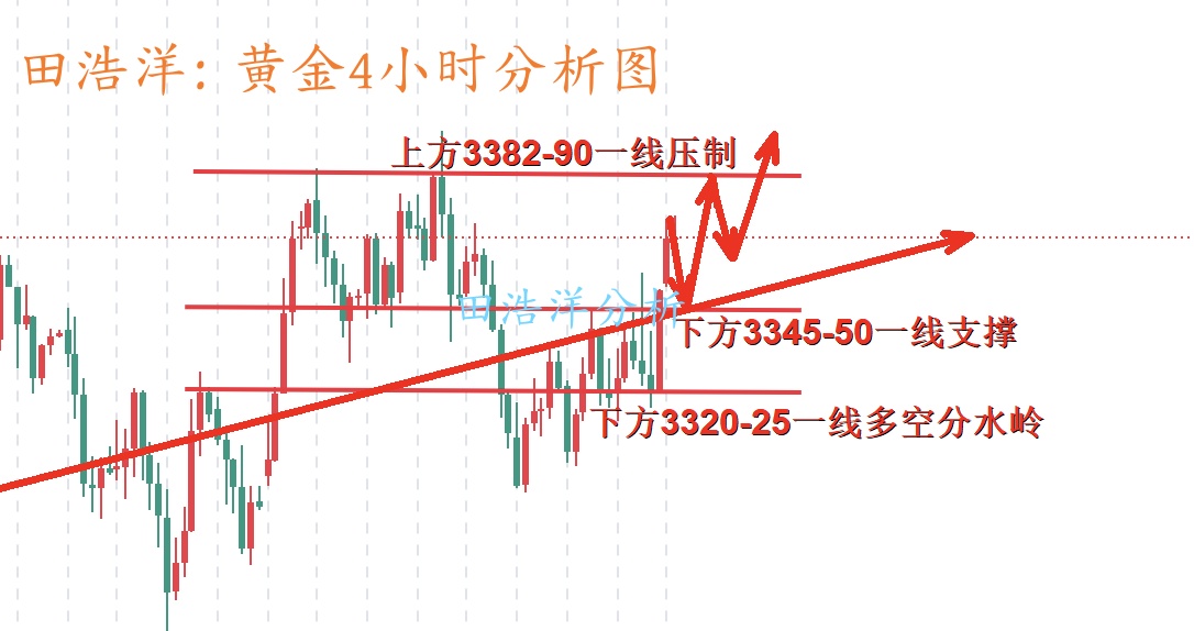 本周以来黄金一路开盘高涨,而且本周初上方一直关注3345-50一线短期压制做空,都是如期回落获利出局,周二午夜我们文章也是给了3315一线的支撑不破做多的策略思路,周三黄金一路震荡上行,完全没有回落下跌的迹象,特别是周三美盘CPI数据利多后,黄金也突破了近期的新高到了3360一线,最终再次回踩企稳3320一线并延续加速上行强势收盘在3357一线,日K线报收中阳,整体金价低点逐步抬升宣告多头强势主升形态确立,如果你目前黄金操作不理想,希望田浩洋能让你的投资少走弯路,欢迎前来沟通交流! 从4小时分析来看,今日下方支撑关注3345-50一线附近,日内回踩依托此位置继续主多顺势看涨不变,短期多头强势